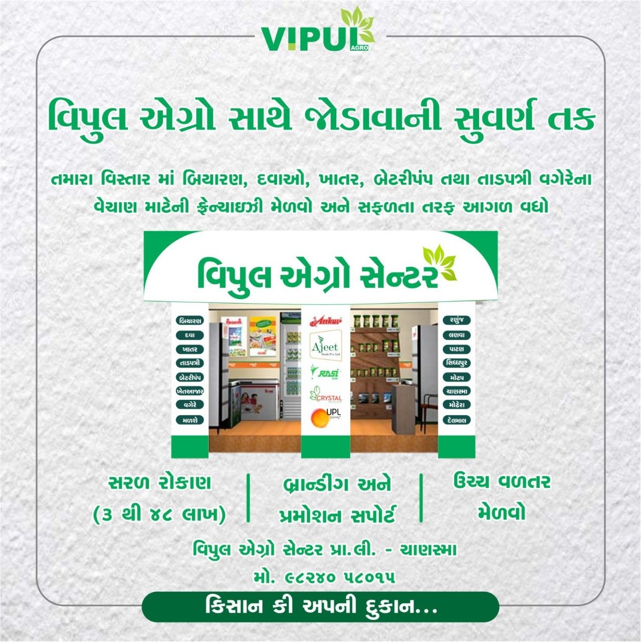અમારી કંપની વિપુલ એગ્રો સેન્ટરપ્રા.લી જે ગુજરાત ના દરેક જિલ્લા / તાલુકા / ગ્રામ્ય કક્ષા એ ફ્રેન્ચાઈઝી આપવાની છે.